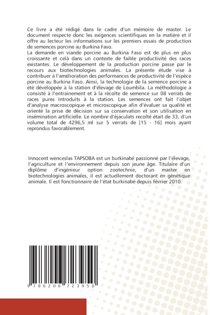 Ce livre a été rédigé dans le cadre d’un mémoire de master. Le document respecte donc les exigences scientifiques en la matière et il offre au lecteur les informations sur les premiers essais de production de semences porcine au Burkina Faso.La demande en viande porcine au Burkina Faso est de plus en plus croissante et celà dans un contexte de faible productivité des races existantes. Le développement de la production porcine passe par le recours aux biotechnologies animales. La présente étude vise à contribuer à l’amélioration des performances de productivité de l’espèce porcine au Burkina Faso. Ainsi, la technologie de la semence porcine a été développée à la station d’élevage de Loumbila. La méthodologie a consisté à l’entrainement et à la récolte de semence sur 08 verrats de races pures introduits à la station. Les semences ont fait l’objet d’analyse macroscopique et microscopique afin d’évaluer sa qualité et orienté la prise de décision sur sa conservation et son utilisation en insémination artificielle. Le nombre d’éjaculats recolté était de 33, d’un volume total de 4296,5 ml sur 5 verrats de [15 – 16] mois ayant reprondus favorablement.